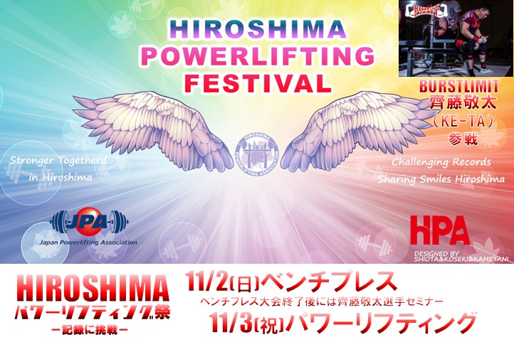 広島県パワーリフティング祭 のエントリー表を 大会情報ページに掲載しました。→こちら 今大会の試技はプラットフォーム1面で行います 検量時間はスケジュールに記載していますので ご自身のグループの検量時間をご確認ください。 ※検量時間までに会場にお越しください ※会場へは8:30より入場できます 投稿ナビゲーション 齊藤敬太選手 パーソナルセッションご案内(11/3 広島県パワーリフティング祭) 広島県パワーリフティング祭 結果発表